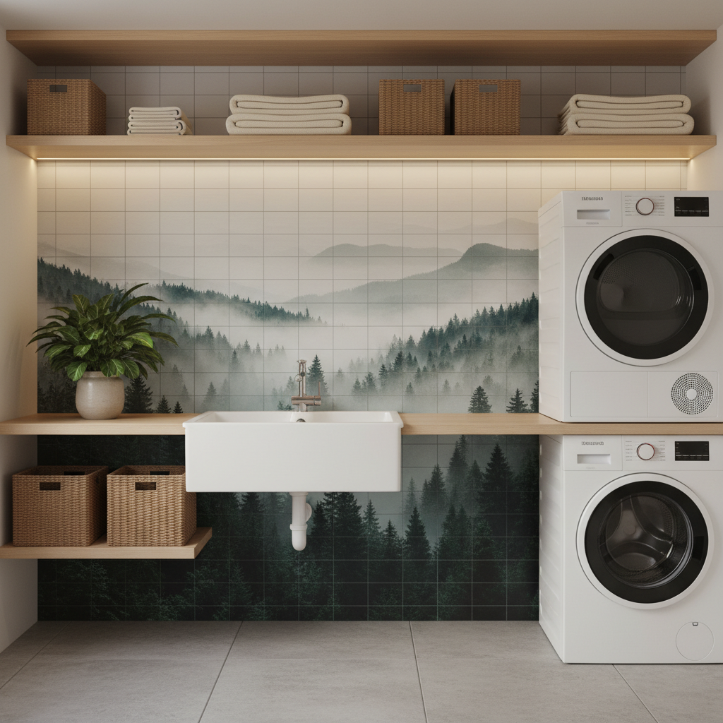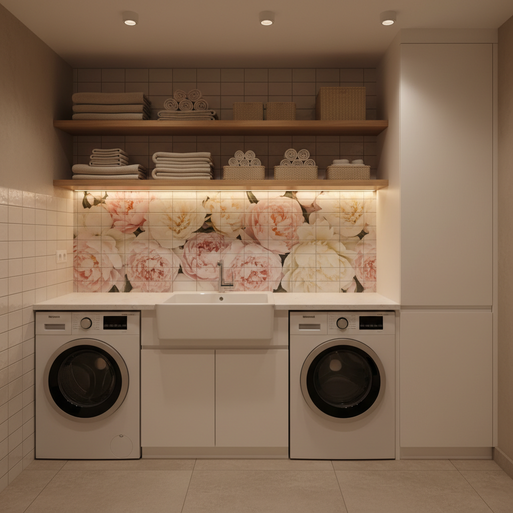 Плиточный фартук в постирочной с УФ-печатью защищает стену от воды, моющих средств и нагрузки, одновременно добавляя эстетики. Изображение печатается на керамике и стыкуется в цельное панно по сетке плитки — можно выбрать спокойный орнамент или вдохновляющий сюжет. Поверхность легко очищается, не впитывает запахи и долго сохраняет цвет. Практично для утилитарных зон, где важны чистота, долговечность и аккуратный вид. Поможем подобрать сюжет, который красиво «ложится» по швам.